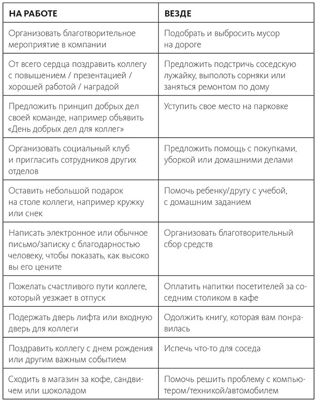 Теперь взглянем, как можно практиковать добрые дела на работе и не только. Ниже представлена таблица жестов доброй воли, из которой вы для начала можете черпать идеи. Готовы на более грандиозные свершения? Флаг вам в руки, однако не забывайте, что мелочи тоже имеют огромное значение.