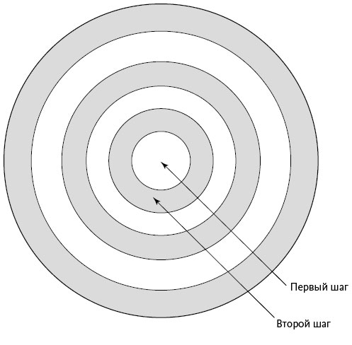 • Круг влияния. Позитивный психолог Шон Эйкор рекомендует метод под названием «Круг Зорро»[206]. Его принцип: сначала научитесь сражаться в рамках небольшого круга, нарисованного вокруг вас, и лишь затем расширяйте его границы. Во-первых, выберите цель, которую хотите реализовать. Во-вторых, определите круг влияния или один шаг на пути к цели, который вы уверенно можете осилить. Овладев новой территорией, начинайте медленно расширять границы круга и продолжайте делать это, пока не достигнете цели.