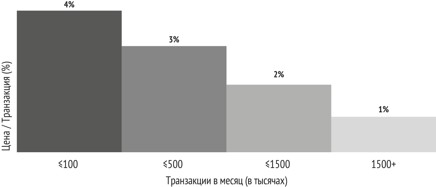 Такая ценовая структура демонстрирует клиентам, что чем больше они пользуются вашими услугами, тем выгоднее это для них. Это понравится клиентам больше, чем фиксированная комиссия 3 % независимо от числа транзакций.