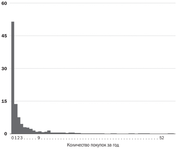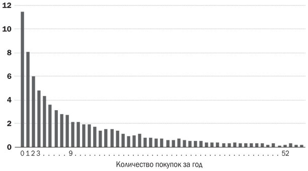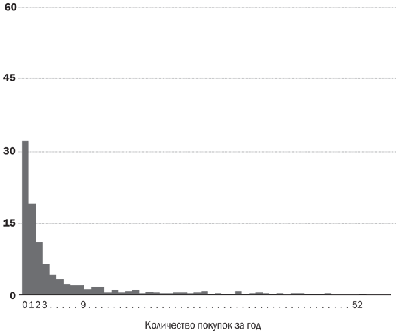 На другом конце покупательского спектра располагаются немногочисленные потребители, которые часто приобретают продукт этой категории, – и среди них лишь немногие покупают не просто часто, а очень часто. Эти покупатели важны, поскольку, невзирая на малую численность, обеспечивают значительную долю объема продаж. Например, порядка 4 % покупателей Coca-Cola, оплачивающих чек за этот напиток раз в неделю или чаще (а это более 52 раз в год), обеспечивают бренду Coca-Cola почти четверть годового объема продаж.