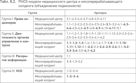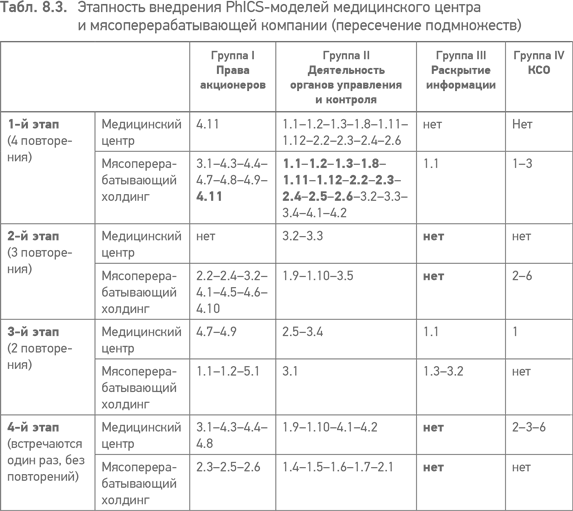 В итоге мы видим, что из общего множества (V) 82 рекомендаций CGBP для медицинского центра требуется к внедрению 30 (это и есть собственно PhICS-модель его системы корпоративного управления), а для мясоперерабатывающего холдинга – 52 (а это и есть собственно PhICS-модель его системы корпоративного управления). Кроме того, следует иметь в виду, что у компаний не только существуют различия в общем объеме необходимых к внедрению рекомендаций, но и отдельные рекомендации имеют различную этапность внедрения.