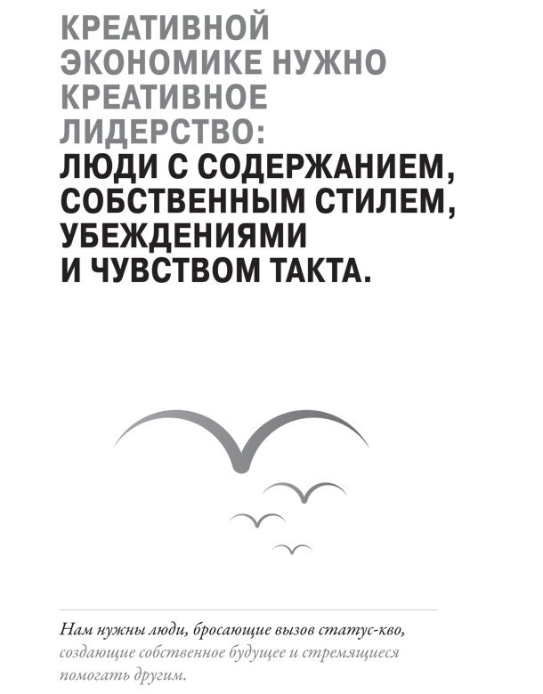 Подход очень прост, но при этом эффективен. Нам нужны люди, бросающие вызов статус-кво, создающие собственное будущее и стремящиеся помогать другим. Огромным спросом пользуются люди, имеющие достаточно эмоциональных и интеллектуальных сил, чтобы, находясь в состоянии постоянного потока, не терять связи и реагировать на вызовы этого сложно устроенного мира. Нам нужны люди, которые сочетают в себе содержание и стиль, убеждения и чувство такта.