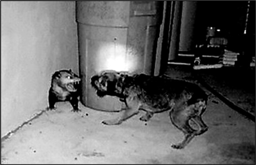 Вороны, с точки зрения охраны природы, очень вредны. Они сводят на нет численность певчих птиц в городах, разоряя их гнезда и поедая птенцов. Из-за деятельности таких собачьих кормильцев бессмысленно закрывать помойки. Но если бы все знали, что бесхозных собак в городе нет, никому бы не пришло в голову устраивать около мусорных контейнеров кормушки для крыс и ворон. Между тем, крысы настолько почувствовали собственную силу, что легко отгоняют собак от своих прикормленных мест (рис. 11). На фото показательный случай: собака подходит к мусорному бачку, нюхает, затем из недр появляется крыса и издает пронзительный звук. Друг человека в панике ретируется. Но скоро на месте друга может оказаться и сам человек.