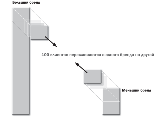 Представим рынок, где присутствуют только два бренда. Один скромный, и его доля рынка составляет 20 % (всего 200 клиентов). Второй крупнее, доля рынка у него – 80 % (численность клиентской базы – 800 человек). Если доли потребителей сохраняются, то их отток должен равняться их приросту. Допустим, крупный бренд каждый год теряет (и приобретает) сотню клиентов. Тогда в условиях этого двухбрендового рынка бренд меньшего размера должен тоже терять (и приобретать) 100 клиентов (рис. 3.1). Коэффициент оттока потребителей у небольшого бренда равен 50 % (100/200), тогда как у крупного этот показатель составит всего 12,5 % (100/800).