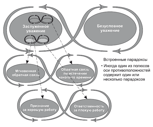 Еще один пример – руководитель, обративший внимание на парадокс между заслуженным уважением и безусловным уважением. Выражая заслуженное уважение сотруднику руководитель демонстрирует признательность за хорошую работу и призывает к ответственности за работу плохую; в противном случае он не достиг бы всей полноты «заслуженного уважения» (рис. 3). В это понятие встроена еще одна пара противоположностей: «мгновенная обратная связь» и «обратная связь по истечении какого-то времени». Это означает вклад и/или критику в отношении проекта в режиме реального времени и обратную связь, базирующуюся на долгосрочных наблюдениях за продуктивностью работы.