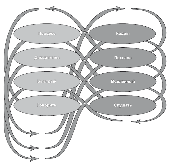 Вот наглядный пример: Джек только что вышел в отставку из Вооруженных сил в ранге генерала и возглавил отдел продаж компании, активно сотрудничающей с Министерством обороны США. Он привнес в работу ощущение важности процесса; в то же самое время он знал ценность делегирования полномочий и поощрения талантливых работников. Джек нанял директора отдела кадров, который в гораздо большей степени полагался на умение генерала хорошо разбираться в текущих делах. В конце концов чрезмерная сконцентрированность отдела на качестве рабочих процессов привела к тому, что дисциплина возобладала над похвалой, а наказание – над поощрительными стимулами. Такой акцент произвел деморализующий эффект и вынудил многих работников покинуть отдел (рис. 5).