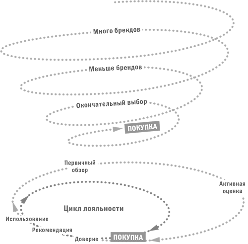 Автор описывает «путь покупателя к решению» как состоящий из четырех стадий: рассмотрение выборки брендов; оценка с помощью поиска информации у знакомых, в обзорах продукции и в других местах; покупка; наслаждение покупкой, рекомендации и установление связи. Если связь покупателя с брендом становится достаточно прочной, то можно будет войти в цикл «покупка – наслаждение – рекомендация – связь», полностью минуя первые две стадии.
