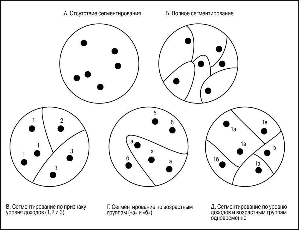 Многие производители не видят смысла в приспособлении своих товаров для удовлетворения нужд каждого конкретного покупателя. Вместо этого продавец выявляет широкие разряды покупателей, отличающихся друг от друга своими требованиями к товару и/или своими ответными маркетинговыми реакциями. Например, продавец может обнаружить, что потребности меняются в зависимости от уровня доходов покупателей. На рис. 7.2,В принадлежность каждого покупателя к той или иной группе по уровню доходов обозначена соответствующим номером (1, 2 и 3). Покупатели, относящиеся к одному и тому же классу по уровню доходов, отделены от остальных линией. При сегментировании по уровню доходов получается три сегмента, причем сегмент покупателей класса 1 оказывается самым многочисленным.