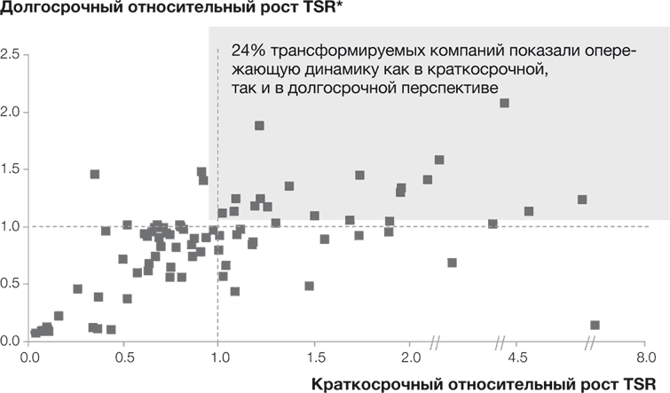 Примечание: Совокупная акционерная доходность (TSR), скорректированная на индекс роста компаний S&P 500 или соответствующий глобальный индекс отраслевого роста; 1 = такой же темп роста, как в отрасли; N = 88 фирм, проходящих трансформацию, с 2001 по 2013 год.