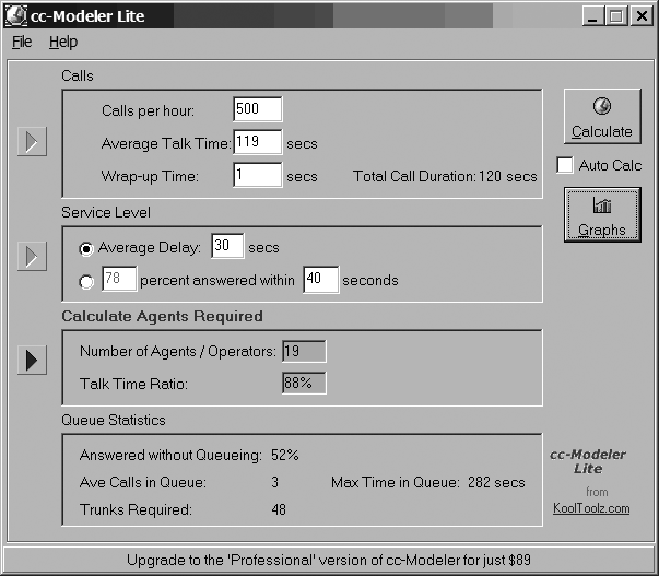 Рис. 2.5. Результаты расчета числа вызовов в час по калькулятору cc-Modeler Lite с сайта www.kooltoolz.com