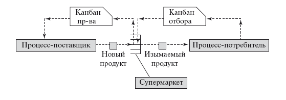 Супермаркеты обычно располагаются в непосредственной близости от процесса-поставщика (предшествующего процесса по технологической цепочке), что дает ему возможность отслеживать, когда и как часто продукцию забирает процесс-потребитель. Для каждого изделия в супермаркете отведено свое место, с которого специально выделенный для этой цели рабочий забирает продукты в объеме, необходимом для следующего звена в цепочке поставок. Забрав какое-либо изделие, рабочий передает сигнал процессу-поставщику (например, в форме карточки канбан или пустой тары) о необходимости произвести дополнительное количество этого изделия (рис. 4.16).