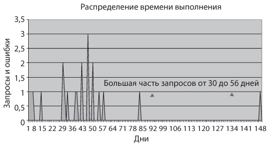 Следующий показатель, который нас интересует, демонстрирует то, насколько предсказуемо наша организация выполняет обещания в соответствии с определением классов обслуживания. Этот показатель – время выполнения. Если элемент был ускорен, то насколько быстро нам удалось провести его от заказа к производству? Если элемент относился к стандартному классу, успели ли мы выпустить его в соответствии с целевым временем выполнения? Нагляднее всего эти данные демонстрирует спектральный анализ времени выполнения, который учитывает целевое время выполнения и соглашение об уровне обслуживания для класса обслуживания (рис. 12.2). Отчеты о среднем времени выполнения имеют смысл для учета общей производительности (рис. 12.3), но не очень полезны в качестве индикатора предсказуемости и как средство информирования о возможностях улучшения.