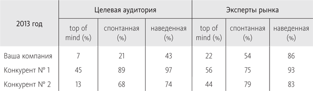 Приведем пример того, какие еще выводы можно сделать, сравнивая показатели узнаваемости в динамике относительно конкурентов. Ниже приведена таблица с условными данными, которую мы рекомендуем составлять вам не реже раза в год.