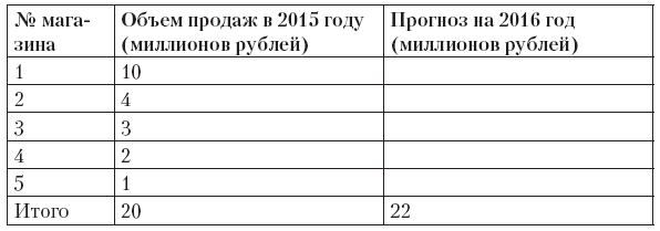 Задача 1. Вы владелец сети магазинов, и ваша задача – спрогнозировать продажи на будущий год. Все магазины вашей сети сходны по площади и ассортименту, но объем продаж у них разный. В таблице вы видите объемы продаж каждого магазина за 2015 год. Эксперты-экономисты считают, что в следующем году рост продаж в целом составит 10 %. Как вы заполните таблицу?