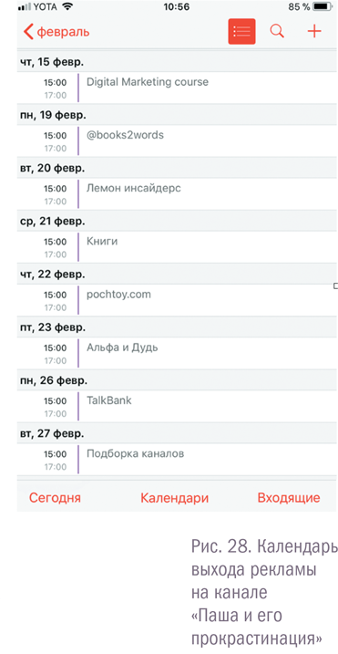 Этой моделью я пользовался еще в 2012 г., когда продвигал на «Литорге» книги. Также об этом методе писал Павел Федоров, владелец классного канала «Паша и его прокрастинация», чьи советы вы прочитаете ниже. Вы создаете материал, содержащий хит-парад различных каналов и… включаете туда свой. В идеале там должно быть четыре канала, которые и так у всех на слуху, и пятый – ваш. Человек, который наткнется на такую подборку, не сразу поймет, что перед ним реклама, и рассудит так: «Эти каналы я знаю, они классные, а вот этот не знаю, но раз он в подборке с такими мощными проектами, значит, он тоже интересный – надо посмотреть». Партизанский метод тоже работает все хуже, потому что им пользуется все больше людей. Но это не значит, что его нужно сбрасывать со счетов.