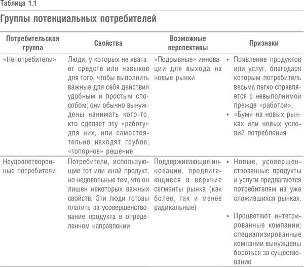 Все эти группы потребителей представлены в таблице 1.1; здесь показано, по каким параметрам выделяется каждая группа и какие возможности наиболее перспективны именно для нее. В таблице также перечислены признаки того, что некая компания уже выгодно использует эти возможности, выводя на рынок соответствующие продукты.
