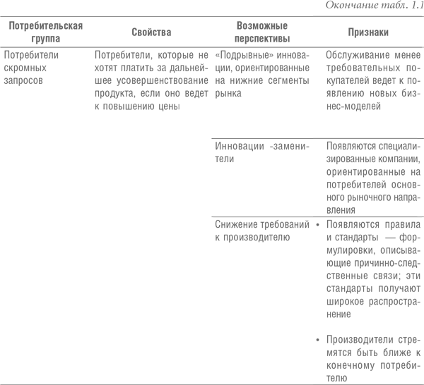 Большая часть этой главы посвящена потребителям из первой и третьей групп. Интересно, что когда аналитики хотят отследить изменения рынка, они обычно обращаются к разработкам, адресованным подсегменту второй группы – так называемым «передовым потребителям», – а это потребители, максимально требовательные к качеству товара. Поддерживающие инновации часто начинают разворачиваться именно в этом подсегменте, а оттуда «спускаются» в те сектора, где царит массовое производство. Но для «подрывных» инноваций «передовые потребители» – это новые рынки или нижние сектора уже существующих рынков. Поэтому для того, чтобы предсказать, как эти инновации скажутся на основном направлении рынка, нужно постоянно наблюдать за нижними секторами, новыми рынками и новыми условиями потребления.