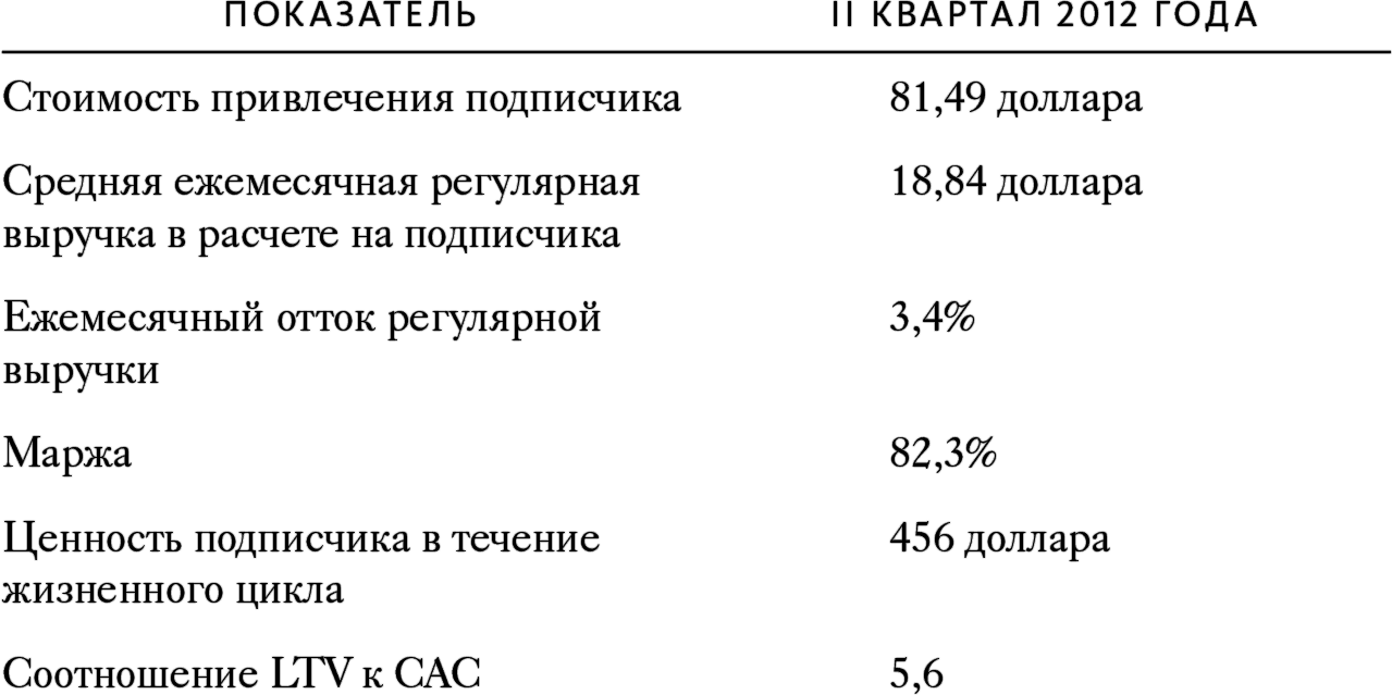 Ко второму кварталу 2012 года Ancestry.com научилась так эффективно привлекать подписчиков, что ее средняя стоимость привлечения подписчика упала до 81,49 доллара. Показатель ежемесячного оттока клиентов оставался довольно высоким, на уровне 3,4 процента в месяц, но это вполне компенсировалось ростом эффективности привлечения новых пользователей, и соотношение ценности подписчика в течение жизненного цикла и стоимости привлечения подписчика держалось на уровне 5,6. Вот некоторые данные.