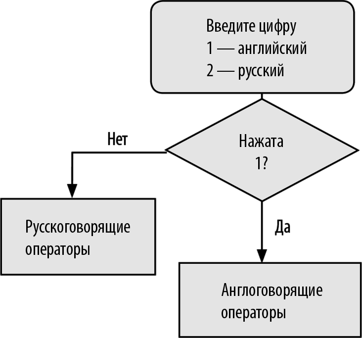 В заключение разговора о входных объявлениях коснусь еще одной важной темы: меню вызова (рис. 3.1). «Меню вызова» – не устоявшийся общепринятый русскоязычный термин (их, собственно, в области Call Center еще практически нет), это просто калька с английского Call Prompting. Но мне этот термин нравится, поскольку хорошо отражает сущность процесса, когда вызывающему абоненту на входе предлагается на выбор несколько вариантов обслуживания: «Если вы звоните по поводу А, нажмите 1, по поводу Б – нажмите 2 и т. д.».