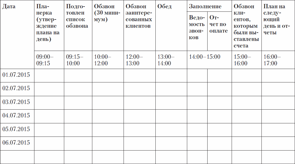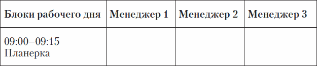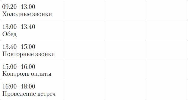 Существует весьма простой инструмент, повышающий эффективность работы менеджеров на 30–40 %. Весь секрет кроется в блочной работе. Очень редко встречаются клиенты, у которых менеджеры, приходя на работу, понимают, что им предстоит делать. Как правило, они либо весь день звонят, либо выполняют задачи стихийно. В итоге результат дня получается размытым. Поэтому необходимо регламентировать рабочий день менеджеров по блокам. Выглядит это следующим образом (табл. 2.2).