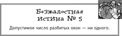 Изрядную часть «нулевой терпимости» вам надлежит тратить на персонал. Снова цитирую Левина (курсив мой): «Когда сотрудник – кто бы это ни был — вредит компании, он становится разбитым окном, каковы бы ни были причины его действий, а вызванный им эффект домино может руинировать весь ваш бизнес».