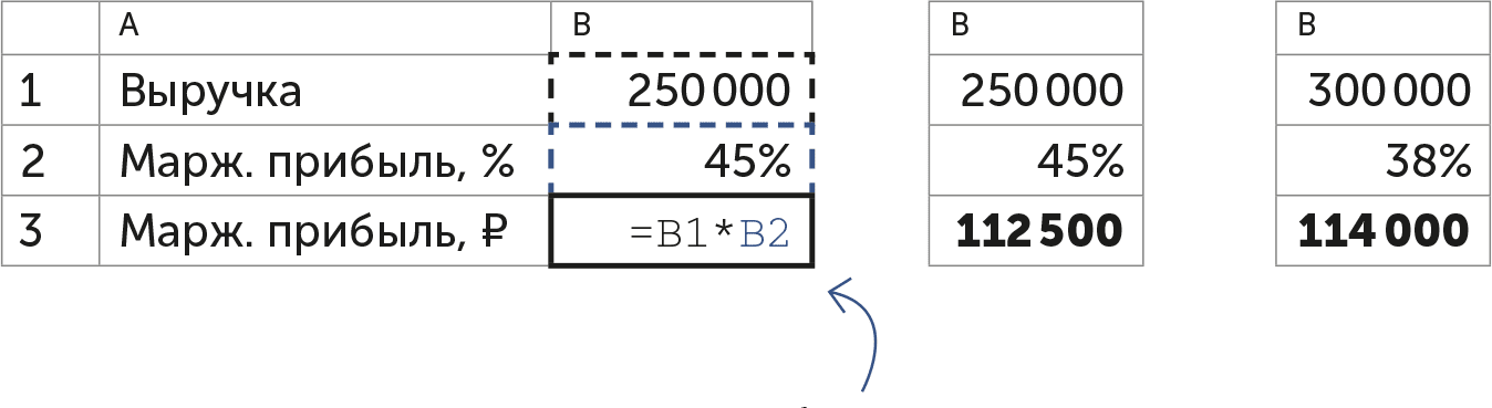 Удобно то, что нам не нужно переписывать формулу в B3, которая считала маржинальную прибыль в рублях. Она как ссылалась на B1, так и ссылается. То, что в B1 теперь не число, а формула, Экселю не важно. Он спокойно берет результат вычисления одной формулы и подставляет в другую.