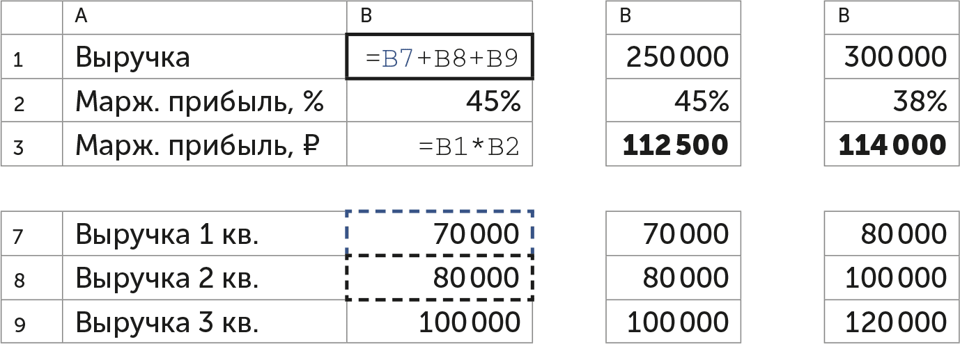 Сила Экселя в том, что результат вычисления одной формулы можно затолкать в другую. Например, у нас в B1 стоит выручка, которую мы считали вручную. А можно посчитать ее автоматически, имея массив данных о продажах. Вместо внесения в B1 готового числа мы напишем формулу, которая сложит выручку за три квартала:
