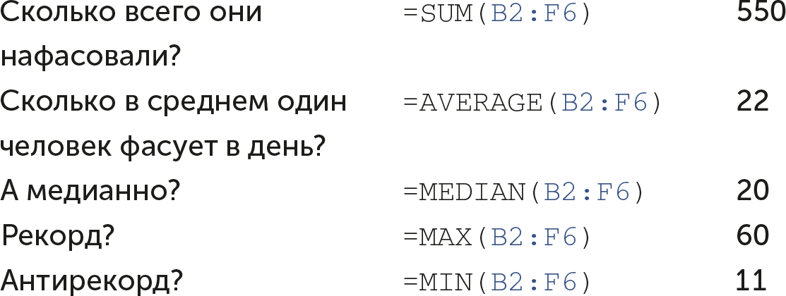 Теперь, выделив диапазон с B2 по F6 и использовав его в функциях, мы можем узнать много интересного об этих данных: