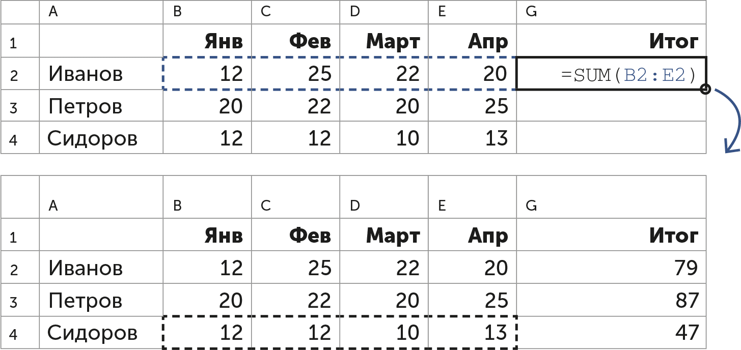 Если сейчас посмотреть в ячейку G4, мы увидим там не формулу из G2 =SUM(B2:E2), а формулу с новыми сслыками: =SUM(B4:E4). Эксель сам догадался, что нужно обновить ссылки на ячейки. Он считает, что если формулу «перетащили» на строку вниз, то все ссылки внутри формулы тоже нужно переместить на строку вниз.