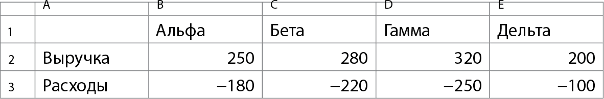 Допустим, у нас есть данные о доходах и расходах четырех учебных центров: «Альфа», «Бета», «Гамма» и «Дельта». Мы хотим посчитать прибыль и сумму налога. Вот как выглядят сырые данные в тысячах рублей: