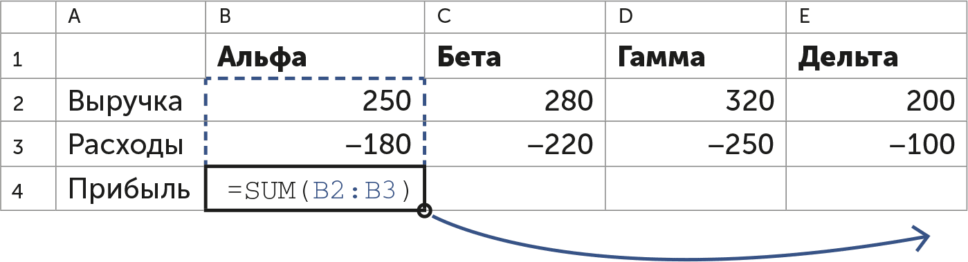 Чтобы узнать прибыль до налогов, нам нужно написать формулу с суммой и распространить ее вправо: