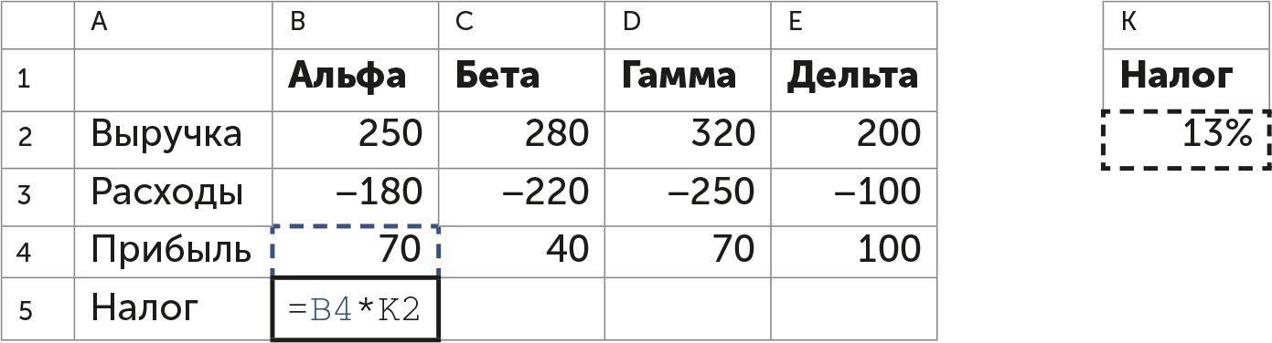 Теперь посчитаем сумму налога. Мы могли бы написать формулу вроде такой: =B4*0,13, где 0,13 — это 13 % налога на прибыль. Но тогда налоговая ставка будет у нас зашита в формуле и мы не сможем ее легко и быстро изменить. Обычно налоговые ставки и прочие константы не зашивают в расчет, а выводят в каком-то отдельном месте таблицы и ссылаются на него. В нашем случае ставка налога сидит в K2: