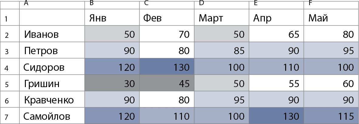 Здесь очевидно, что Сидоров и Самойлов — сильные, Кравченко и Петров — середнячки, а Иванов и Гришин еле тянут. У кого строка зеленее — тот и молодец.