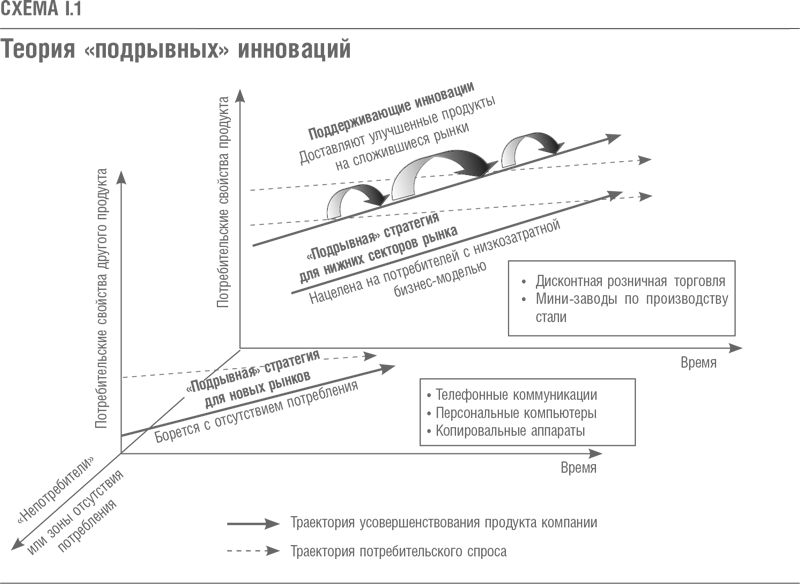 На схеме I.1 представлены основные положения теории «подрывных» инноваций. Мы видим две линии – сплошная линия отражает процесс усовершенствования продукта компании. Пунктирная линия – это показатель потребительского спроса: не количественного спроса (на определенный объем товаров), а качественного – то есть требований к потребительским свойствам продуктов. Как наглядно демонстрируют эти линии, потребности покупателей в отношении того или иного товара оказываются вполне стабильными довольно долгое время. На схеме представлены три типа инноваций. Это поддерживающие инновации; «подрывные» инновации для нижних секторов рынка и «подрывные» инновации, предназначенные для новых рынков.