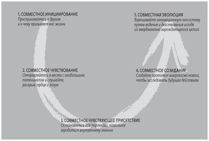 Чтобы произошли глубинные изменения, необходим сдвиг внутреннего пространства, исходя из которого действует система. Это можно выполнить только совместно, используя то, что я называю социальной технологией. Ранее мы обсудили ее отдельные аспекты, теперь рассмотрим в целом и с функциональной точки зрения: какие принципы и практики составляют эту технологию, какие инструменты помогут наладить связь с наилучшим возможным будущим и реализовать его. Социальная технология чувствующего присутствия базируется на пяти основных шагах. Каждый из них основан на описанных ниже принципах и практических методиках. Пять шагов показаны и на рис. 21.1: