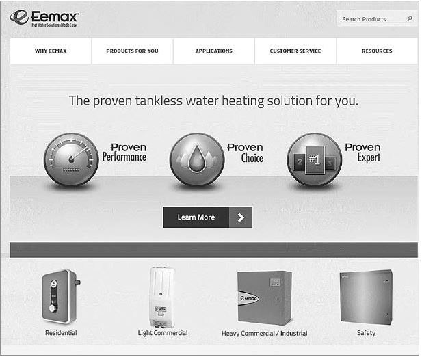 Рис. 8.13. Доводы Eemax на главной странице: надежные проточные водонагревательные системы. Надежная техника. Надежный выбор. Надежная компания
