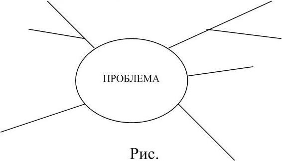 1. В середине листа бумаги (ватмана) записать проблематику, тему, которая будет обсуждаться на занятии. Затем выбрать 2–3 наиболее главных, важных аспекта по этой теме и пометить их как главные ветви, на которых записываются ключевые слова. Последующие мысли в виде ключевых слов подвешиваются уже к существующим главным ветвям или, если это необходимо, прикрепляются к новой главной ветви. Важно, чтобы ни одна мысль не пропала и ничего не мешало потоку мыслей. Кроме этого, желательно провести и выделить взаимосвязи различных аспектов проблемы (см. рис.).