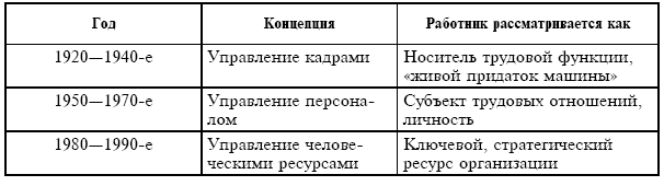 В XX в. произошла смена трех основных концепций кадрового менеджмента, обусловленная изменениями в экономическом, социальном, техническом развитии общества (табл. 1.1).