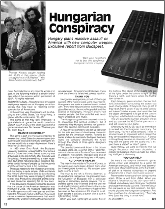 Вот и вся история. Коммунистическая игра, чья интегральная схема была спроектирована компанией из доброй старой Америки, аккуратно собрана одним из наших лучших друзей на Дальнем Востоке – вот они, звенья тайного заговора по подготовке Америки к широкомасштабному коммунистическому захвату. Спасайте наших сограждан, чтоб они не стали жертвами вражеских происков. Закажите это устройство у JS&A. А когда получите его, ни в коем случае не играйте на нем. Вместо этого сразу же отнесите его своим соседям и заставьте их также заказать себе такое устройство. Расскажите им о настоящей причине последней рецессии, о коммунистическом заговоре и о венгерской конспирации.