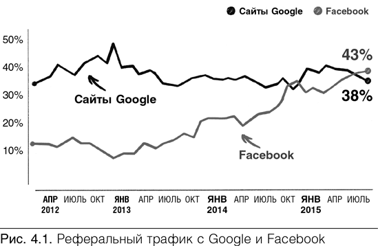 По сообщению аналитической компании Parse.ly, в июле 2015 года Facebook впервые направил на новостные сайты больше трафика, чем Google. Как сообщается в Fortune: «Это исследование охватило 400 крупных новостных СМИ и информационных агентств, в том числе сайты таких традиционных изданий, как Wired, The Atlantic, Reuters и The Daily Telegraph, а также многочисленную группу цифровых изданий, таких как Mashable, The Next Web и Business Insider»{20}.