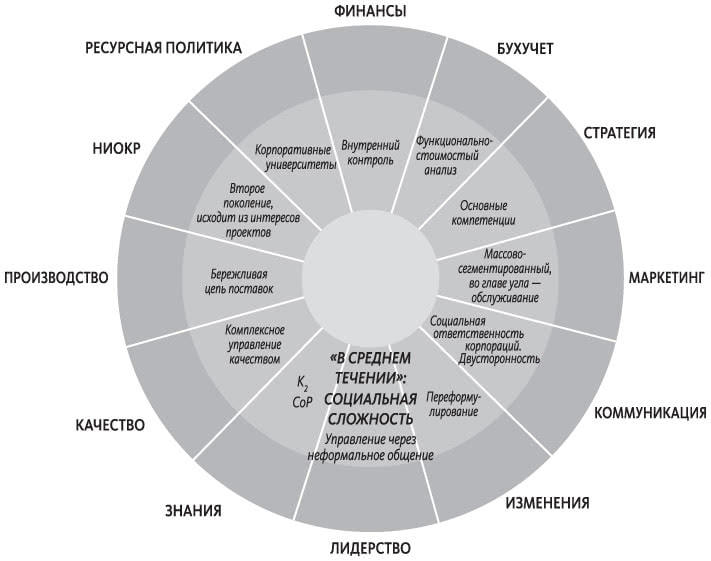 Рисунок 4.2 показывает 12 различных областей управления. Верхняя половина посвящена более осязаемым функциям (производство, персонал, НИОКР, финансы, бухучет, стратегия, маркетинг и продажи), а нижняя – менее ощутимым (качество, знания, лидерство, перемены и коммуникации).