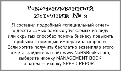 Чтобы получить максимальную прибыль – и выжить – бизнес в наши дни должен следовать «императиву скорости». Императив скорости – это философия и позиция, это всеподчиняющая идея управления бизнесом, которую вы должны сформировать в уме, принять всем сердцем и неустанно насаждать среди ближних. Именно это – главное, что привнес в General Electric Джек Уэлч, и вы тоже можете привнести это в свой бизнес. Императив скорости практически приложим ко многим разным аспектам предпринимательской деятельности, от маркетинга и инноваций до проверки новых стратегий экспансии.