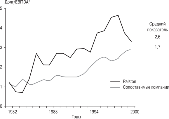 Рис. 6.2. По уровню долга Ralston стабильно опережала конкурентов. Источник: Center for Research in Security Prices (CRSP) и данные компании