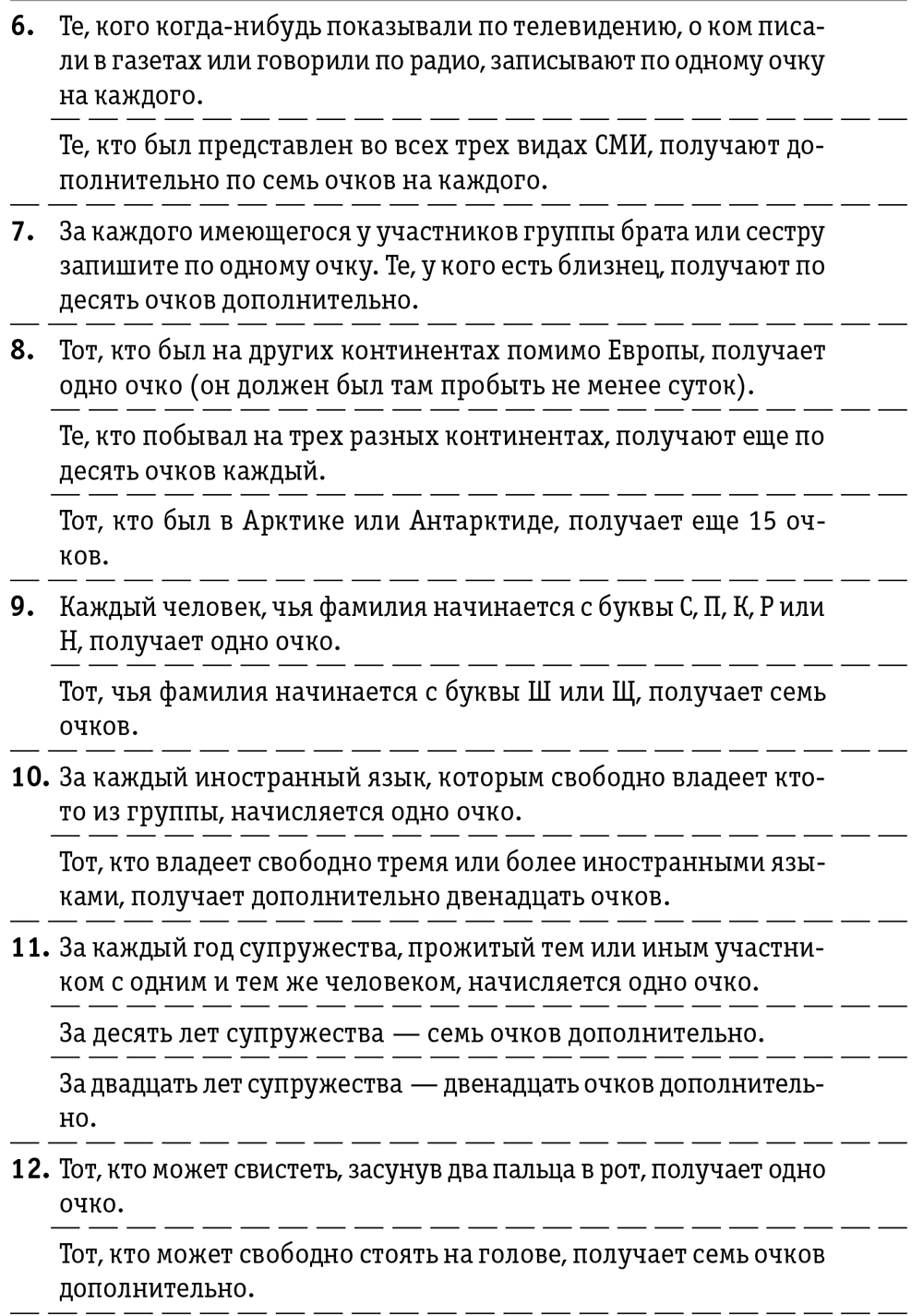4. Помогите тем участникам, которые не смогли найти свою команду, образовать четверки. Если число участников не кратно четырем, то добавьте «лишних» игроков в уже образованные квартеты. Теперь, когда все проблемы решены, дайте сигнал открыть глаза и посмотреть, кто входит в состав их четверки. Затем объясните участникам, что сейчас им представится возможность познакомиться поближе. Каждая группа получает от Вас копию анкеты, заполняя которую она записывает на свой счет определенное количество очков. Задача состоит в том, чтобы заработать как можно больше очков, извлекая выгоду из особенностей каждого участника группы.
