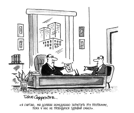 Этап 6. 1 февраля мы рассылаем документ всем руководителям подразделений. Они смотрят на блестящую обложку (на которой мы все изображены стоящими перед новым зданием компании; сначала мы хотели поместить на обложке свой портрет, но отдел PR убедил нас, что это придаст документу несколько личностный оттенок), читают первую страницу (проверяя, есть ли их имя в перечне благодарностей), бегло пролистывают некоторые из глав и убирают документ в ящик стола. Там он и остается до 15 октября следующего года, когда мы вспомним о нем: «Опять подошло время».