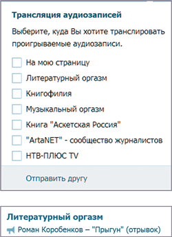 А вот со статусами можно экспериментировать сколько угодно. Как вариант, вы можете сообщать через них о значимых датах – «Сегодня день рождения Иосифа Бродского!». Еще один интересный инструмент – это трансляция музыки в сообществе. Зайдя в аудиозаписи и запустив одну из них, вы можете сделать так, чтобы она отражалась в вашем статусе. Для этого после нажатия кнопки play, наведите курсор на иконку громкоговорителя, которая находится справа вверху. Перед вами появится список ресурсов, в которые вы можете начать транслировать запись. Просто поставьте галочку напротив нужного, и на месте статуса будет отображаться проигрываемое аудио, нажав на которое люди смогут присоединиться к его прослушиванию. Таким образом, например, вы можете запускать и собственные подкасты. Просто запишите аудио (это может быть ваше интервью с кем-то интересным) и опубликуйте файл вышеописанным образом. Одновременно с этим на стене паблика можно дать информацию о том, что прямо сейчас запускается суперинтересный аудиоматериал. Завершить сообщение можно призывом к прослушиванию и к оставлению комментариев-мнений в обсуждении (специально созданном).