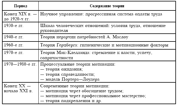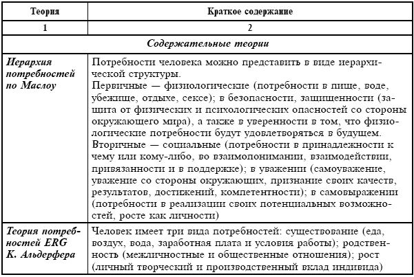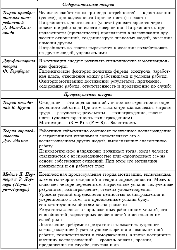 Все вышеперечисленные теории дают менеджерам ключ к построению действенной системы стимулирования персонала к эффективному и производительному труду. В обобщенном виде они представлены в табл. 5.1 и 5.2.