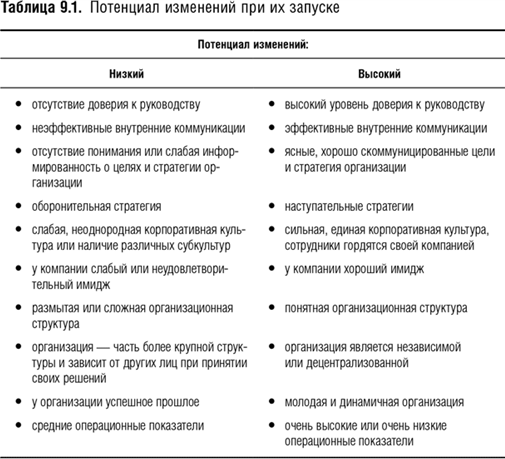 Потенциал изменений является важной характеристикой ситуации при их запуске. Элементы этого потенциала представлены в табл. 9.1. Если потенциал изменений низок, то целесообразно уделить время и попытаться повысить его путем расшивки узких мест и решения проблем, которые, возможно, не привлекали к себе внимания, но тем не менее порождали негативное отношение к изменениям, хотя и не наносили серьезного ущерба операционной деятельности. Такое кажущееся спокойствие быстро исчезает, когда после запуска процесса изменений вдруг начинают ощущаться признаки их низкого потенциала. Учитывая, что руководство может не знать о нерешенных проблемах (и, как следствие, о низком потенциале изменений), прежде чем проводить реформы, рекомендуется выполнить оценку состояния компании, что позволит определить потенциал изменений и при необходимости повысить его.
