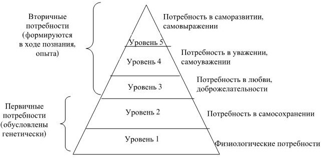 Эти потребности образуют иерархическую структуру, которая определяет поведение человека, причем потребности высшего уровня не мотивируют человека, пока хотя бы частично не удовлетворены потребности нижнего уровня.