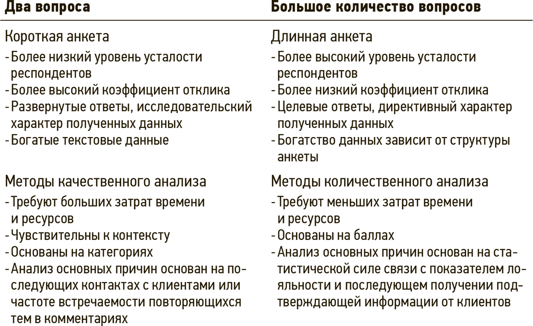 Рассмотрим сначала конкретные различия. Анкета из двух пунктов, в которую включен вопрос о рекомендациях и вопрос, требующий развернутого ответа, меньше утомляет респондентов, обеспечивает более высокий коэффициент отклика и позволяет получить развернутую информацию. Такой подход можно использовать для выполнения качественного анализа, особенно для определения факторов, стимулирующих лояльность разных групп потребителей. Качественный анализ комментариев клиентов может отнять много времени и ресурсов, а полученные выводы будут чувствительны к контексту: ведь в каждом конкретном комментарии трудно определить, что именно хотел сказать респондент, если не обладать подробной информацией об этом человеке и его отношении к компании.